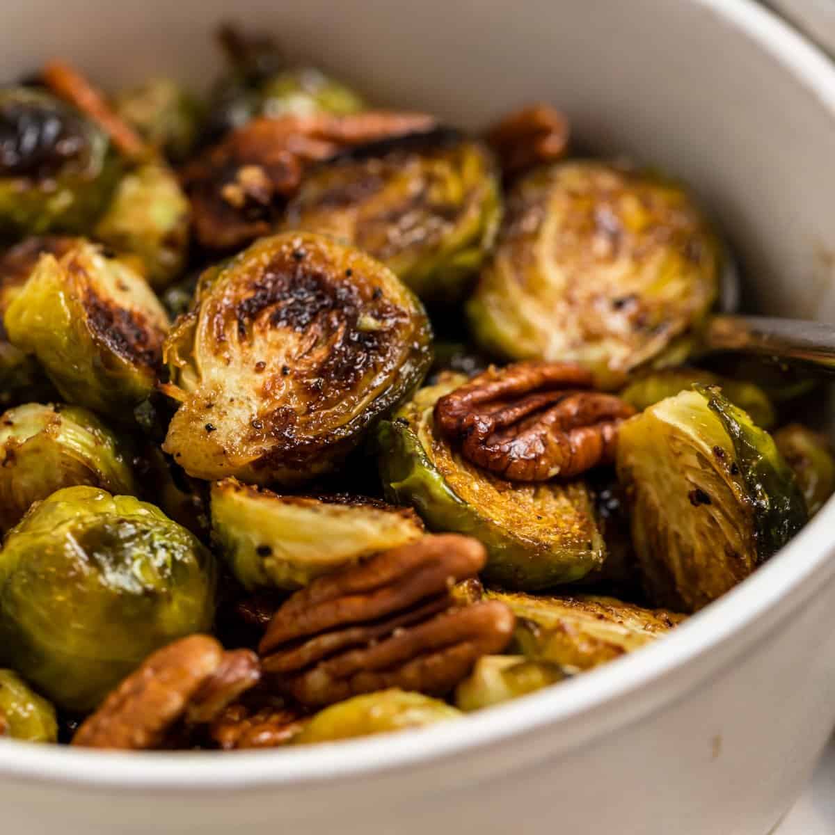4. Transférez les choux de Bruxelles rôtis et les noix de pécan dans un saladier. Ajoutez du sel et du poivre et servez.