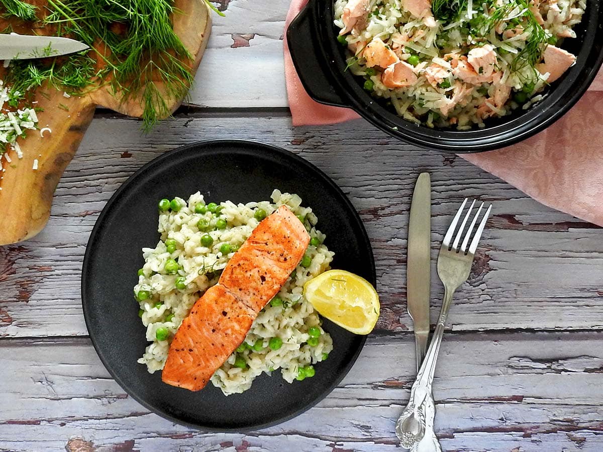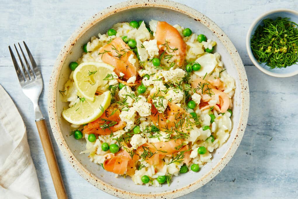 5. Enfin, ajoutez le saumon fumé au risotto. Vous pouvez soit poser le saumon sur le dessus pour une présentation visuellement attrayante, soit le mélanger complètement pour une température uniforme dans tout le plat. Le choix vous appartient!