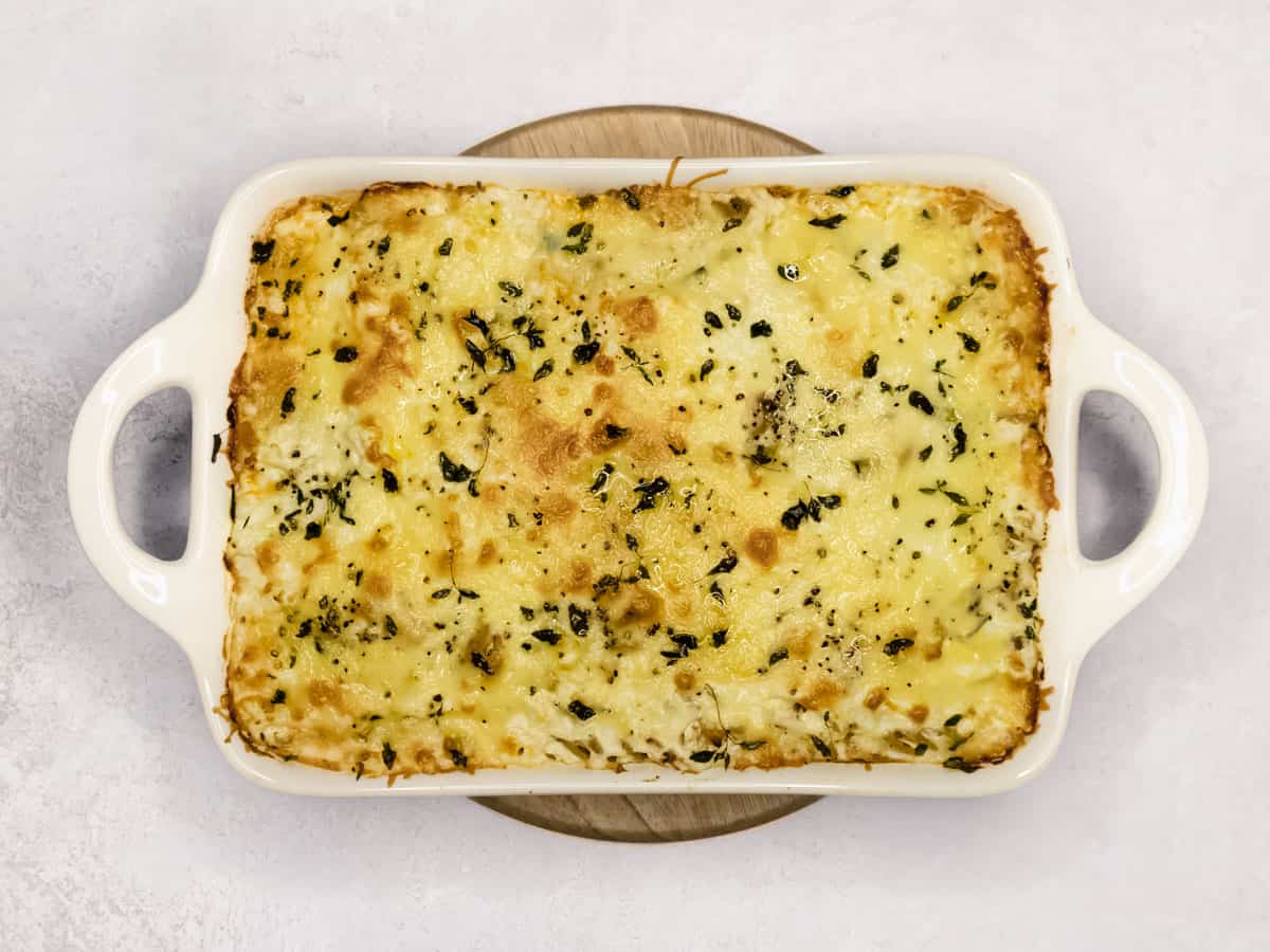 - Superposez et faites cuire à nouveau: Saupoudrez le reste du fromage mozzarella et cheddar, ajoutez le parmesan et parsemez le poivron vert haché par-dessus. Faites cuire pendant 20 minutes supplémentaires jusqu’à ce que le gratin soit bien chaud et que le fromage soit doré et bouillonnant.