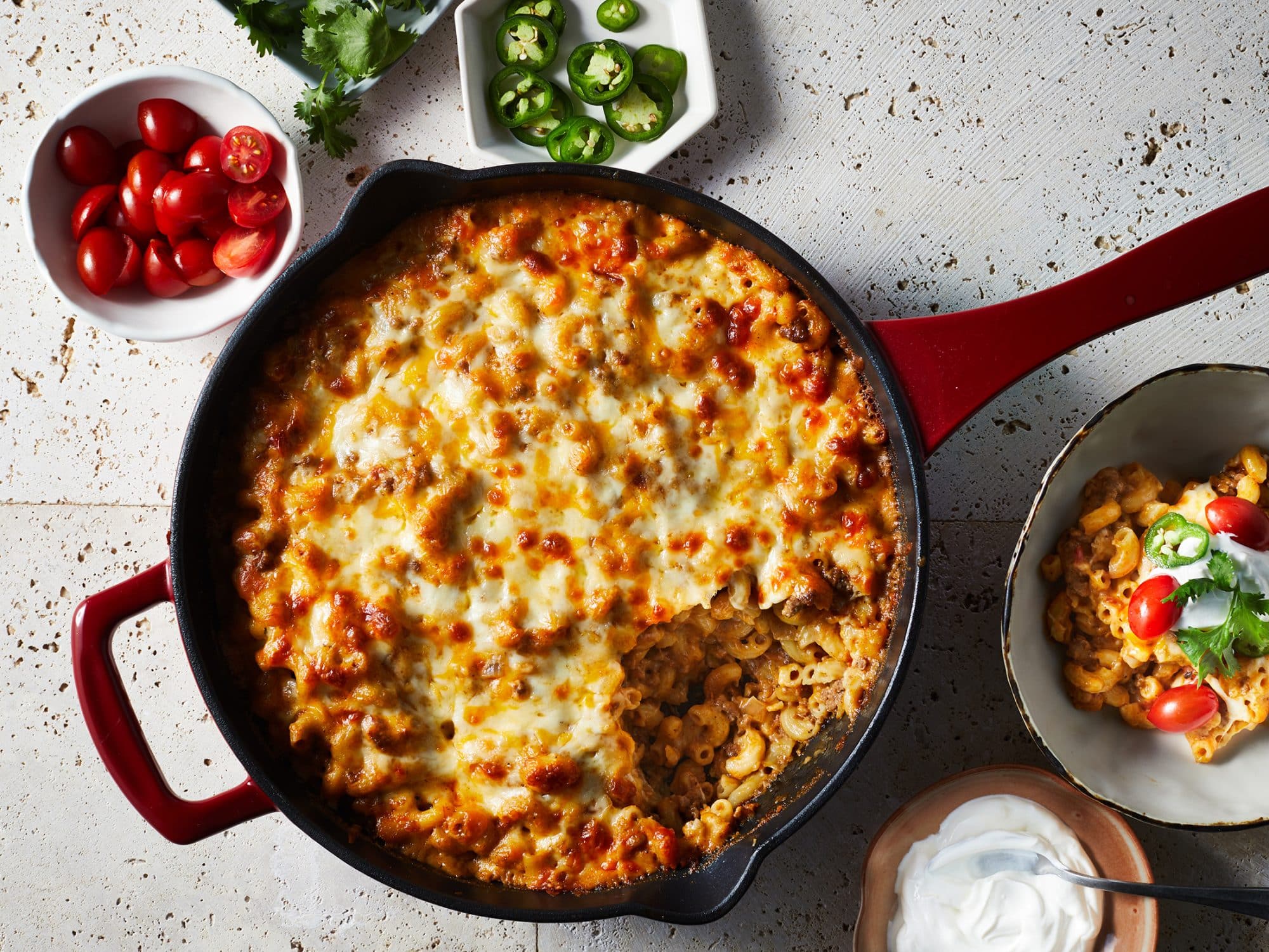 - Servez votre Macaroni au Fromage Façon Taco bien chaud, éventuellement avec une cuillerée de crème aigre à côté.
