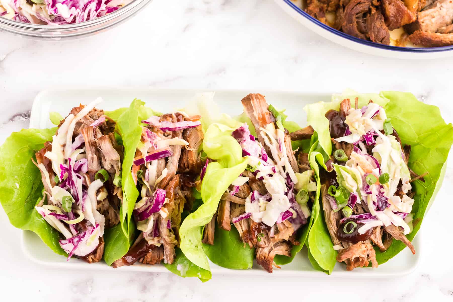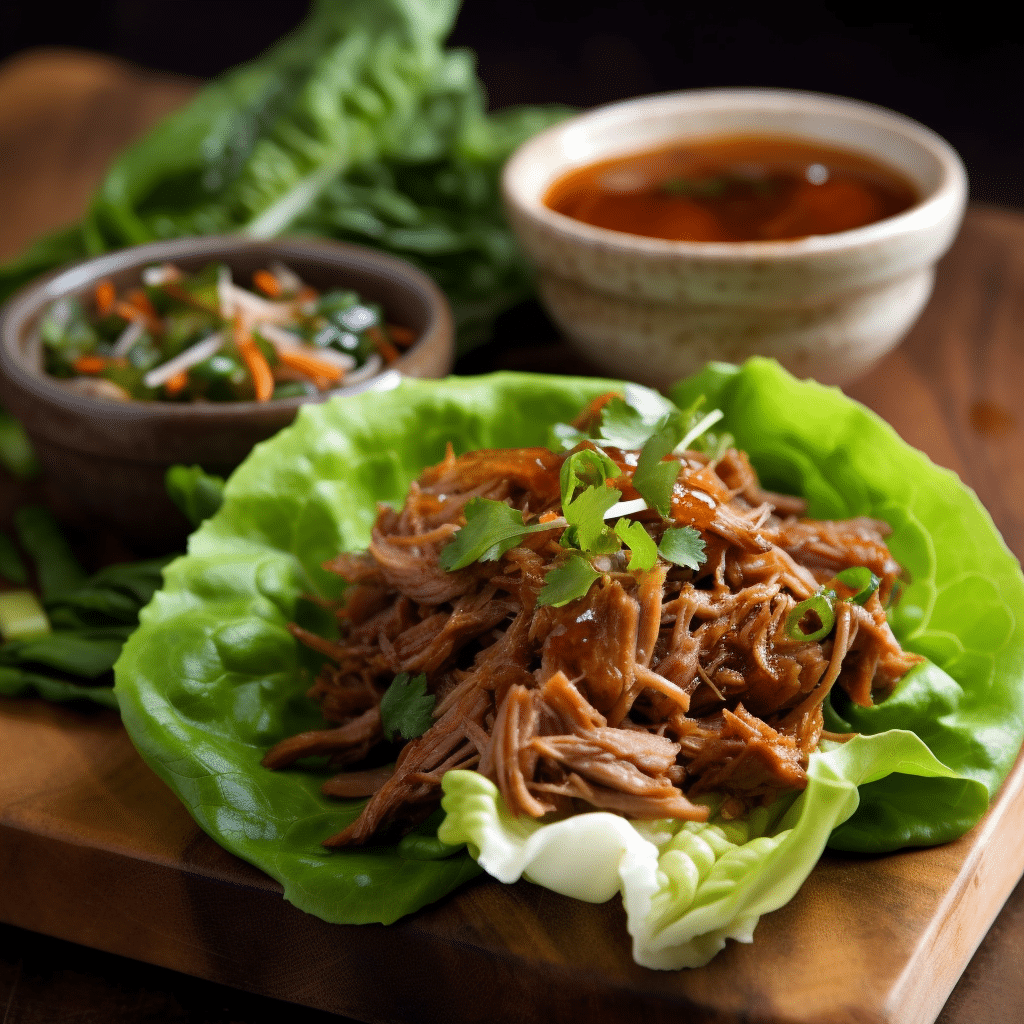 - Assemblez les wraps en plaçant une portion de porc saucé sur chaque feuille de laitue Boston. Garnissez-les de radis finement tranchés et arrosez-les de la sauce restante. Pour une explosion de saveurs supplémentaire, servez avec des quartiers de lime (en option).